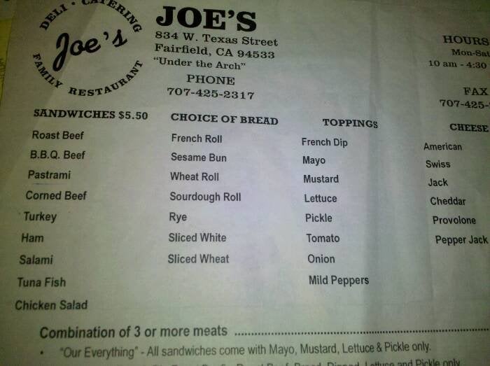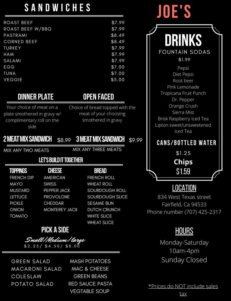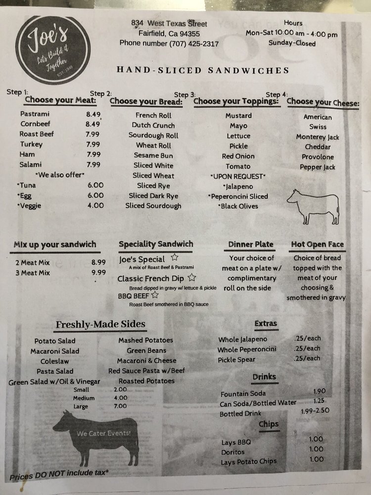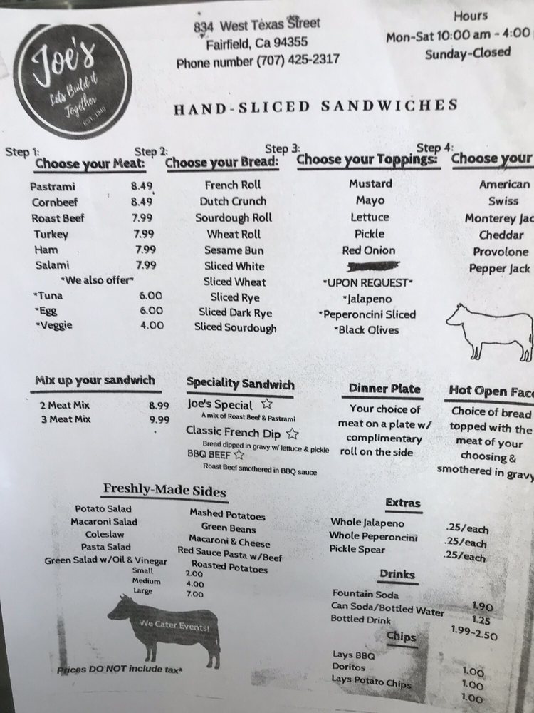 Joe's Buffet, located in Fairfield, CA, is a casual dining spot specializing in sandwiches and salads. This welcoming establishment offers a variety of amenities, including takeout, reservations, and catering services. Customers rave about the generous portions and great quality of the food, particularly the roast beef sandwiches. Despite some minor criticisms about the au jus and mashed potatoes, the overall service is praised for being friendly and courteous. Reviews highlight the hot-beef sandwich as a must-try item, with customers enjoying the flavorful meats and robust side dishes. With a loyal customer base spanning over 40 years, Joe's Buffet continues to impress with its hearty comfort food offerings and cozy atmosphere.